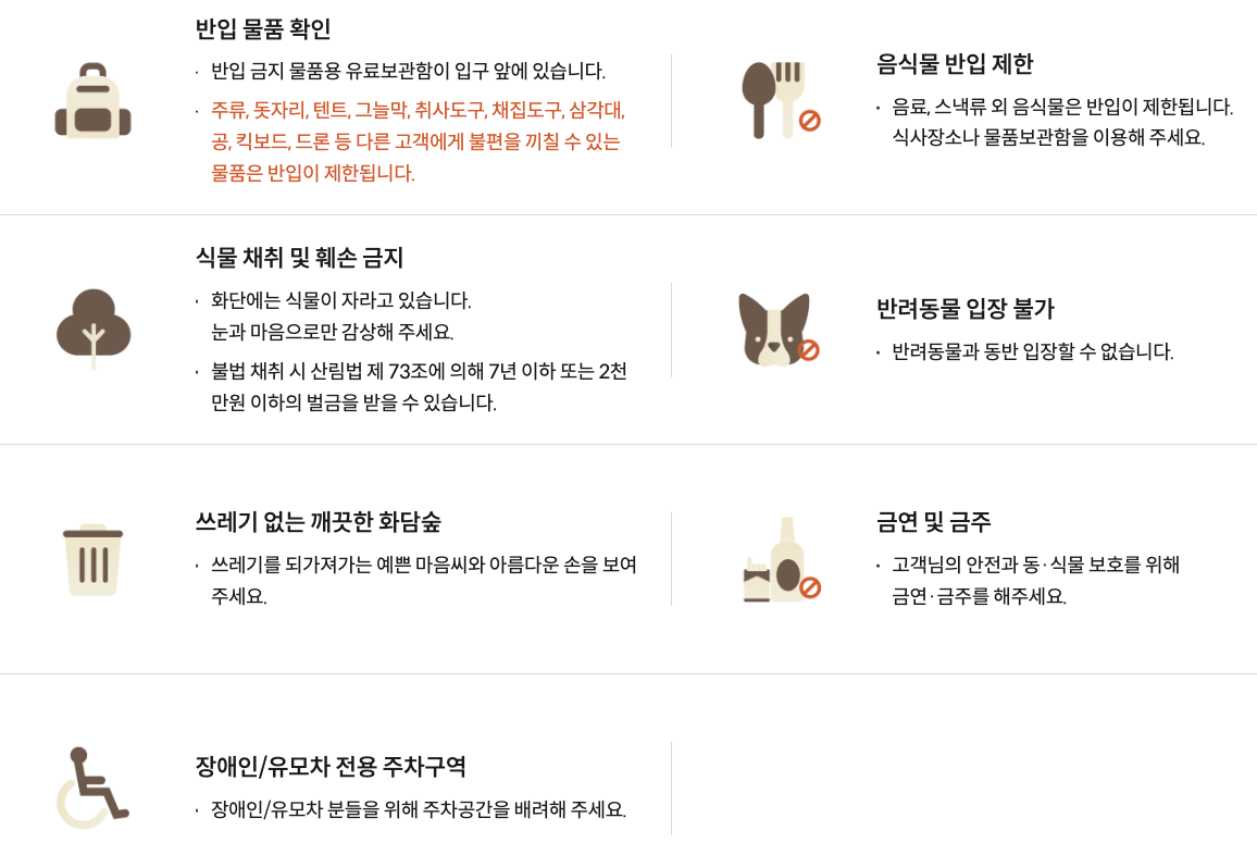 • 간단한 간식 및 물: 숲 내부에 카페가 있지만, 간단한 간식과 물을 미리 준비하는 것이 좋습니다. (외부 음식물 반입은 제한될 수 있으니 확인 필요)
