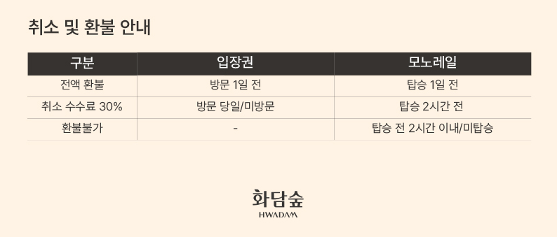 • 모노레일 운행: 숲 전체를 한눈에 조망할 수 있는 모노레일은 화담숲의 상징이자 놓칠 수 없는 즐거움입니다.
