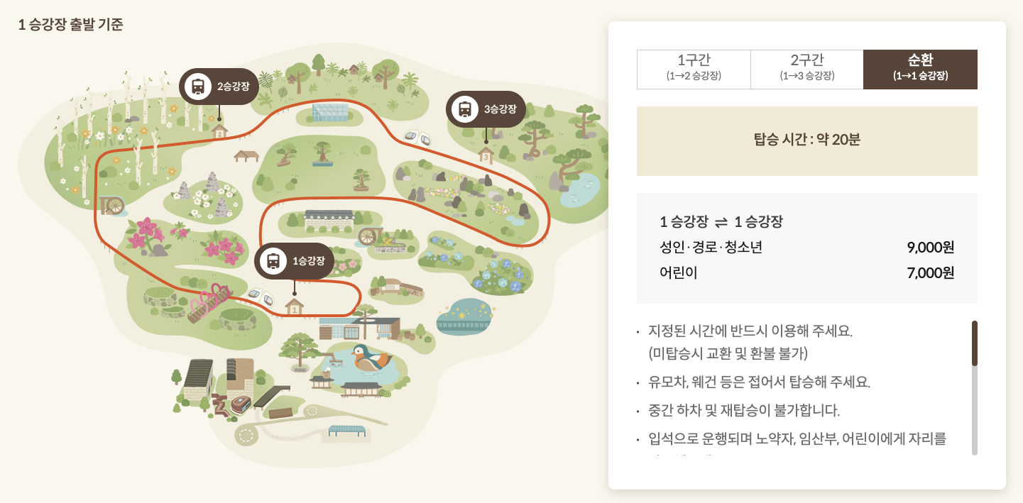 • 코스 선택: 1승강장에서 출발하여 2승강장, 3승강장을 거쳐 1승강장으로 돌아오는 전체 코스(약 20분), 또는 1승강장에서 2승강장까지 한 구간만 이용하는 등 다양한 코스가 있습니다. 원하는 코스를 미리 정해두세요.
