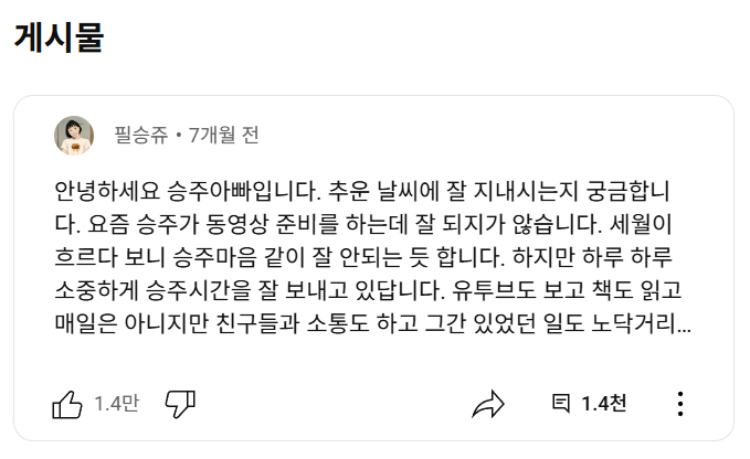 "필승쥬님은 비록 우리 곁을 떠났지만, 그녀가 남긴 용기, 사랑, 그리고 희망의 메시지는 영원히 기억될 것입니다. 그녀의 투병기는 많은 이들에게 삶의 의미를 되새기게 하는 소중한 유산으로 남아있습니다."