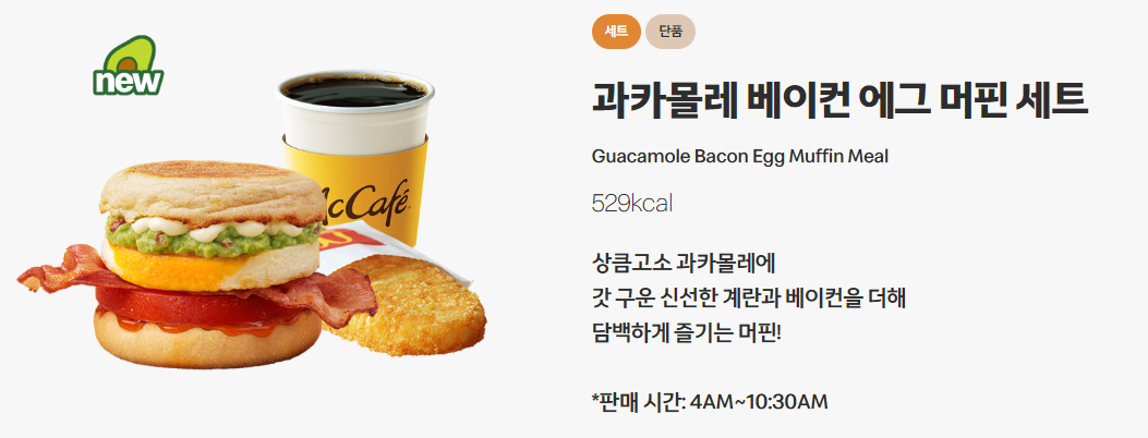 - 과카몰레 베이컨 에그 머핀 단품: 4,600원