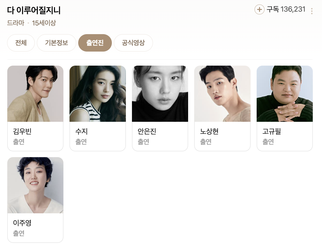 화려한 다이루어질지니출연진은 드라마에 대한 기대를 한껏 끌어올리는 주역들입니다. 김우빈, 수지 두 주연 배우를 필두로, 믿고 보는 배우들이 대거 포진해 있습니다.