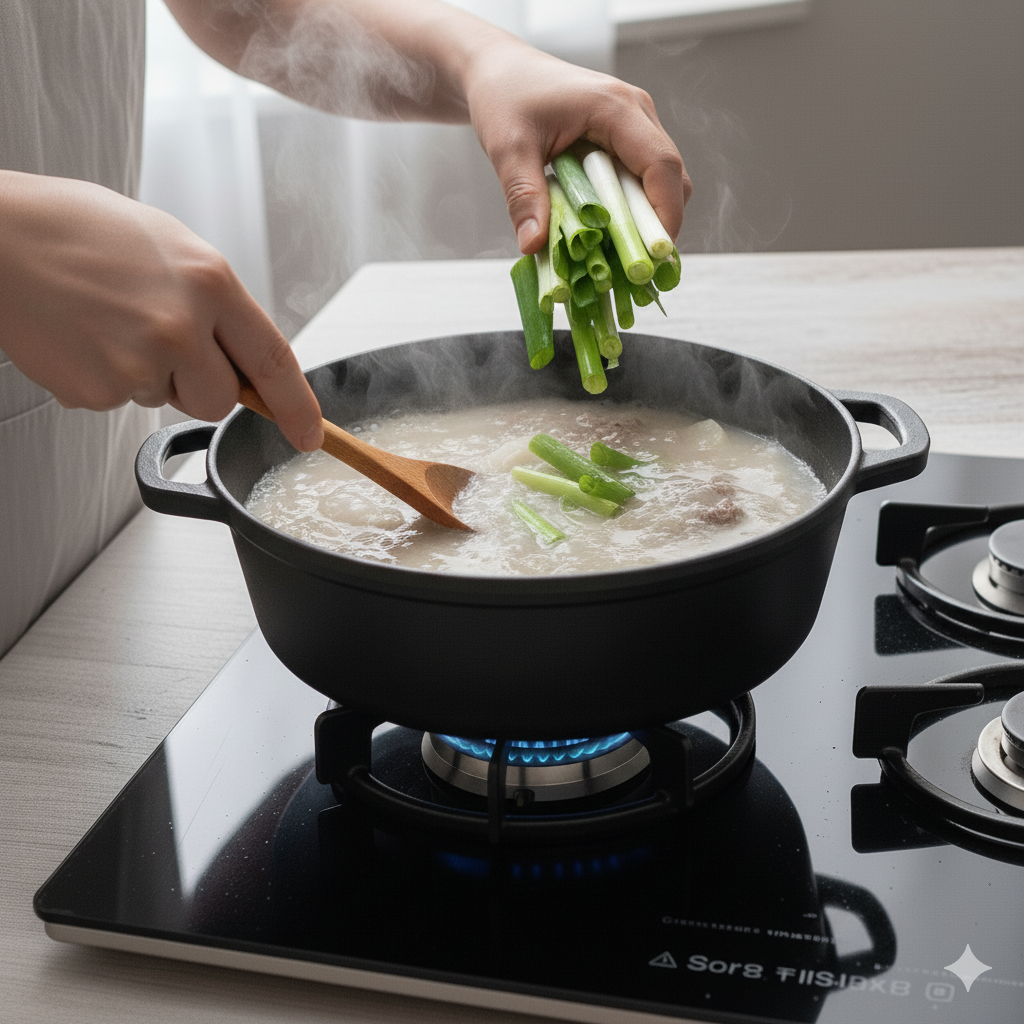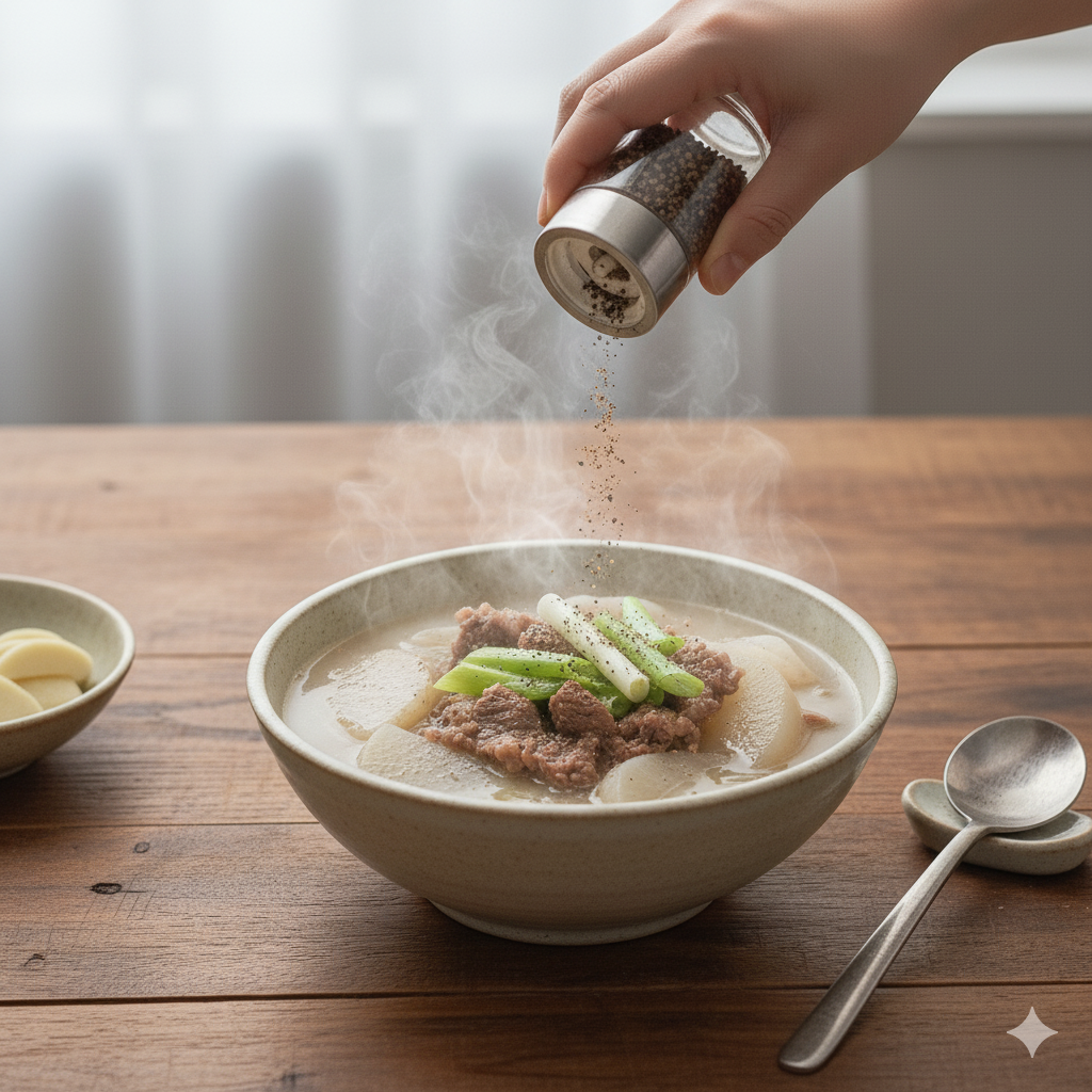 - 마무리 간 & 대파 (1분): 무가 투명하게 잘 익었으면, 대파를 넣고 소금과 후추로 기호에 맞게 간을 조절합니다. 한소끔 더 끓여내면 따끈하고 시원한 소고기무국 완성!