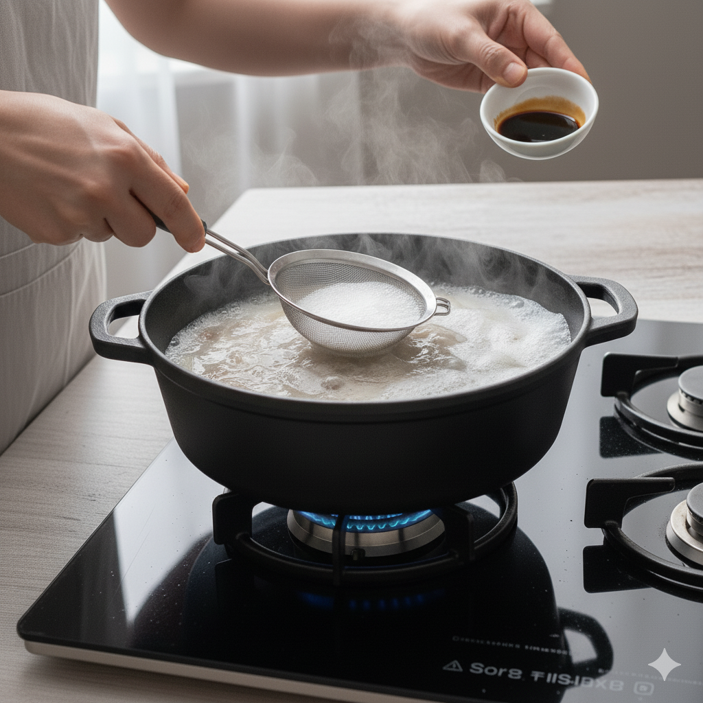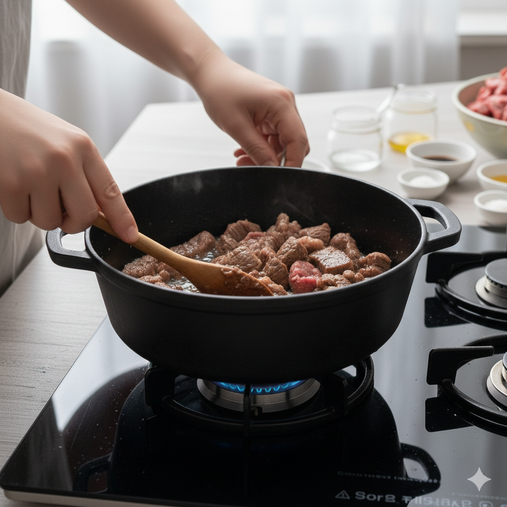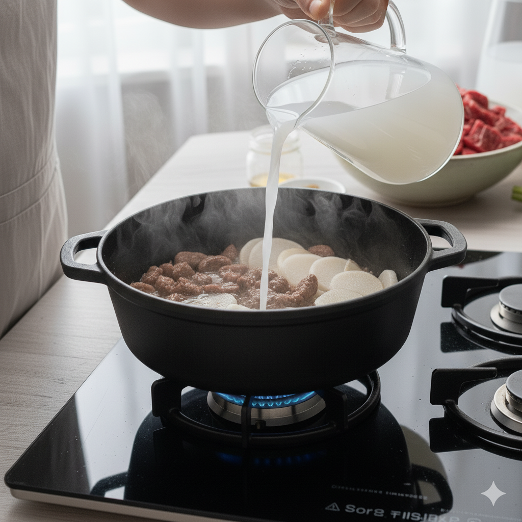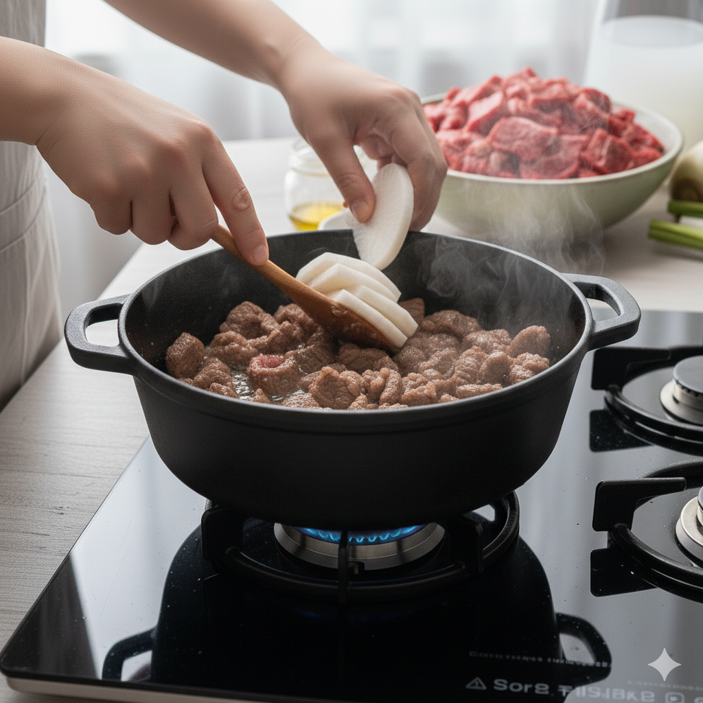- 무와 육수 넣고 끓이기 (5분): 볶은 소고기에 얇게 썬 무를 넣고 1분 정도 더 볶아줍니다. 무가 살짝 투명해지기 시작하면 미리 준비해둔 육수(쌀뜨물도 좋아요!) 700ml를 붓고, 남은 국간장 0.5큰술을 넣은 뒤 팔팔 끓여줍니다. 뚜껑을 닫고 5분간 강불에서 빠르게 끓여 무가 충분히 익도록 합니다.
