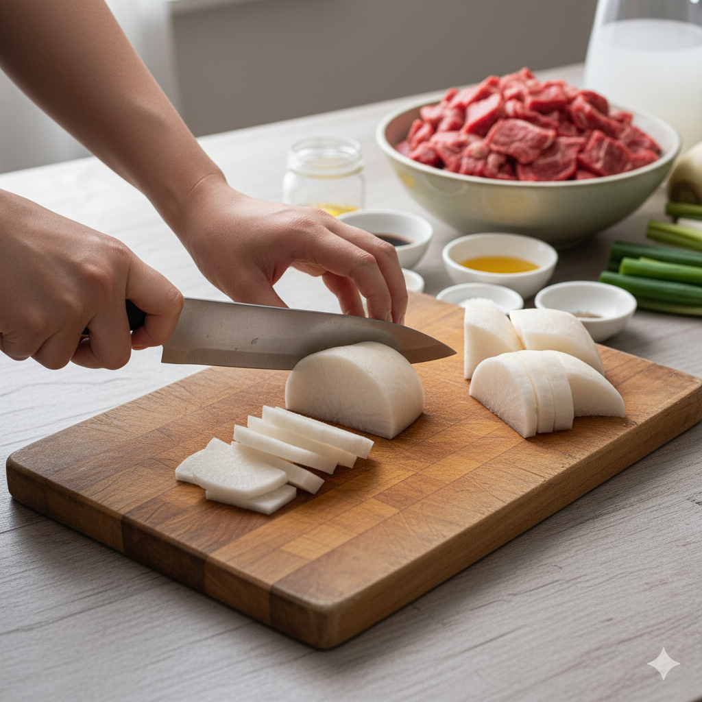 - 핏물 제거 & 무 손질 (1분): 소고기는 미리 찬물에 담가 핏물을 빼줍니다 (냉장고에서 30분~1시간 정도 미리 빼두면 좋아요. 급할 땐 키친타월로 꾹꾹 눌러 핏물을 제거). 무는 얇게 나박 썰어 준비합니다. 무를 얇게 썰어야 빨리 익고 국물에 시원한 맛이 잘 우러나옵니다.