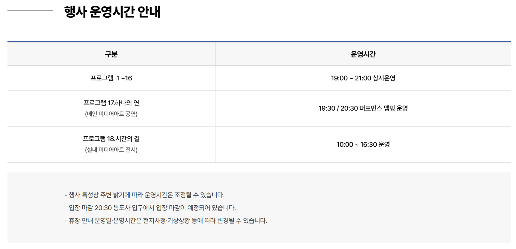 운영 시간 확인: 방문 전 반드시 통도사미디어아트 공식 홈페이지나 관련 안내 채널을 통해 당일의 정확한 운영 시간을 확인하는 것이 중요합니다. 특히 주말이나 공휴일에는 마감 시간이 연장될 수도 있습니다.