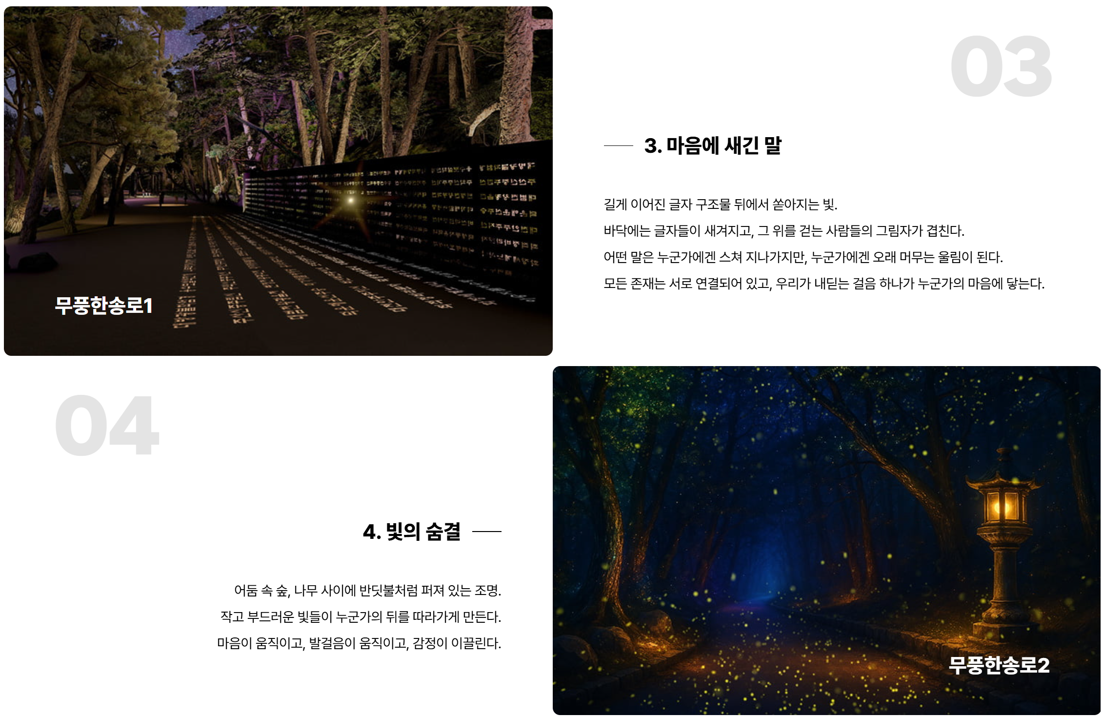 시시각각 변하는 자연과의 조화: 미디어아트는 고정된 작품이 아닙니다. 밤하늘의 별, 스쳐 지나가는 바람, 나뭇잎의 움직임 등 자연과의 상호작용 속에서 매 순간 다른 분위기를 연출합니다. 이 모든 것을 함께 느껴보세요.
