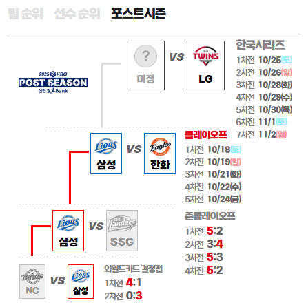 - 탄탄한 선발진: 준플레이오프 4경기에서 선발 투수 전원이 퀄리티스타트를 기록하며 평균자책점 1.05라는 압도적인 기록을 세웠습니다. 최원태, 가라비토, 원태인, 후라도로 이어지는 로테이션은 여전히 강력합니다.