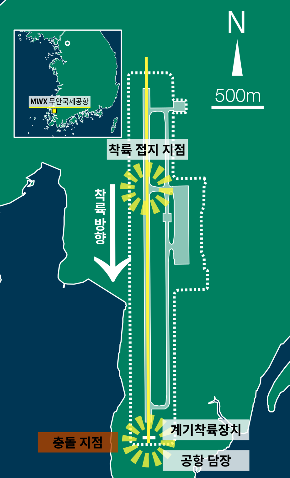 사고 원인은 조류 충돌(버드 스트라이크)로 인한 엔진 손상과 랜딩기어(착륙 장치) 미작동이 가장 유력하게 지목되고 있습니다. 관제탑은 착륙 3분 전인 오전 8시 57분 조류 충돌 주의 경고를 보냈고, 1분 후 기장이 긴급 조난 신호인 '메이데이'를 선언했습니다. 항공기는 랜딩기어 없이 동체 착륙을 시도했으나 활주로 끝단까지 속도를 줄이지 못하고 둔덕과 충돌했습니다.