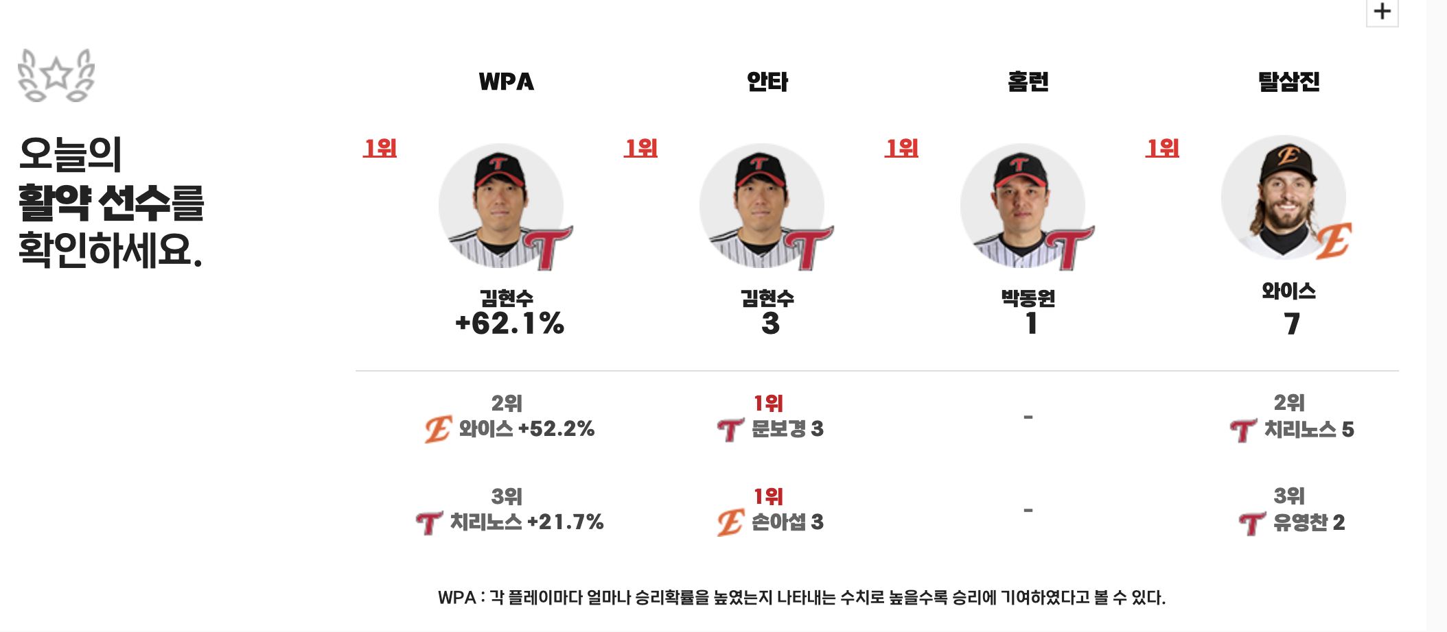 - 라이언 와이스 (선발투수): 7.2이닝 4피안타 7탈삼진 3사사구 1실점. 117구 역투, 최고구속 156km 기록. 완벽투에도 불펜 붕괴로 승리 날림.