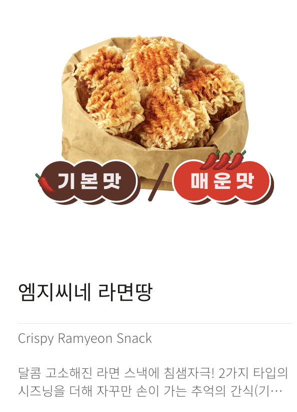 칼퇴리's Tip! 라면땅 프라페는 기본맛 라면땅이 토핑으로 올라가지만, 단품 라면땅은 두 가지 맛 중 선택이 가능하니 꼭 취향에 맞게 골라보세요. 매운맛을 좋아하는 분이라면 단품으로 매운맛 라면땅을 따로 시도해보는 것을 강력 추천합니다!