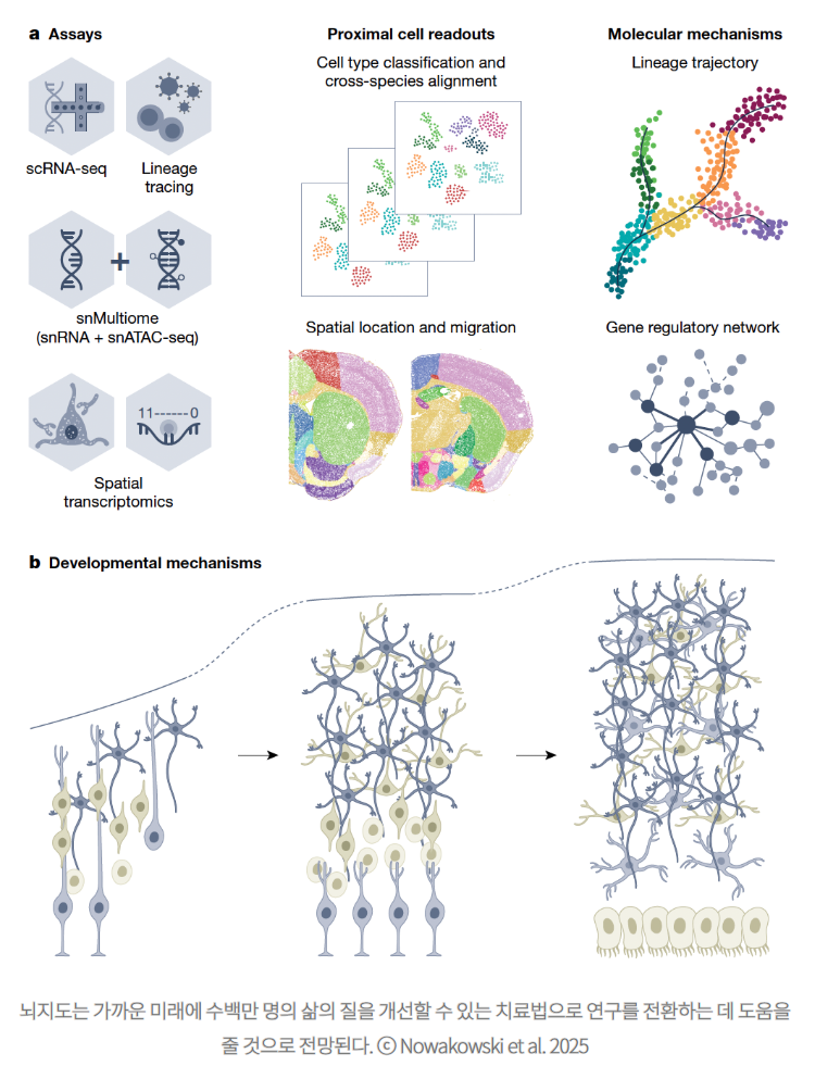 - 자폐 스펙트럼 장애: 신경발달 질환인 자폐증은 성인기가 아닌 뇌 발달 과정에서 시작됩니다. 시간에 따른 변화를 보여주는 뇌 지도는 정상적인 발달 궤적에서 언제, 어떻게 이탈이 발생하는지 밝혀낼 수 있습니다. 특정 세포 유형의 과잉 생산이나 부족, 신경 연결의 비정상적 패턴을 초기에 발견한다면, 조기 진단과 개입을 통해 아이들의 삶의 질을 크게 향상시킬 수 있을 것입니다.