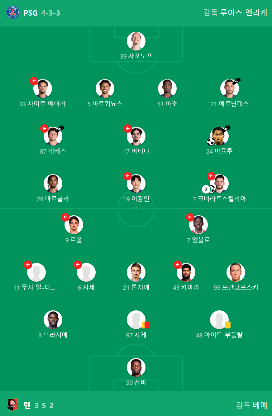렌에게는 설상가상으로 후반 29분, 수비수 제레미 자케가 퇴장당하며 수적 열세에 놓였습니다. 이는 PSG에게 더욱 유리한 환경을 제공했고, PSG는 이 기회를 놓치지 않았습니다. 후반 43분 이브라힘 음바예와 곤살로 하무스가 연속 골을 터뜨리며 경기는 5-0이라는 압도적인 스코어로 마무리되었습니다. 종료 직전까지 집중력을 잃지 않고 득점을 추가하는 모습에서 PSG 선수들의 승리에 대한 열망을 엿볼 수 있었습니다.