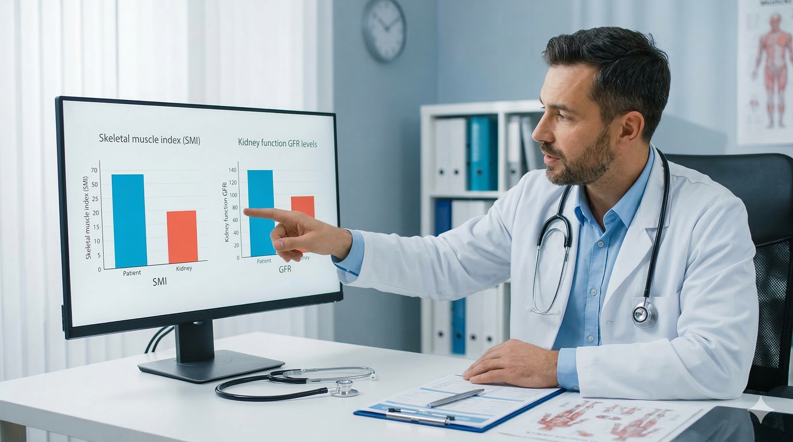 A3. 병원에서 인바디(BIA) 측정을 하거나, 이번 연구에서 활용된 혈액 내 크레아티닌 및 시스타틴 C 수치를 이용한 '근감소 지표(SI)' 계산을 통해 정밀하게 확인할 수 있습니다.