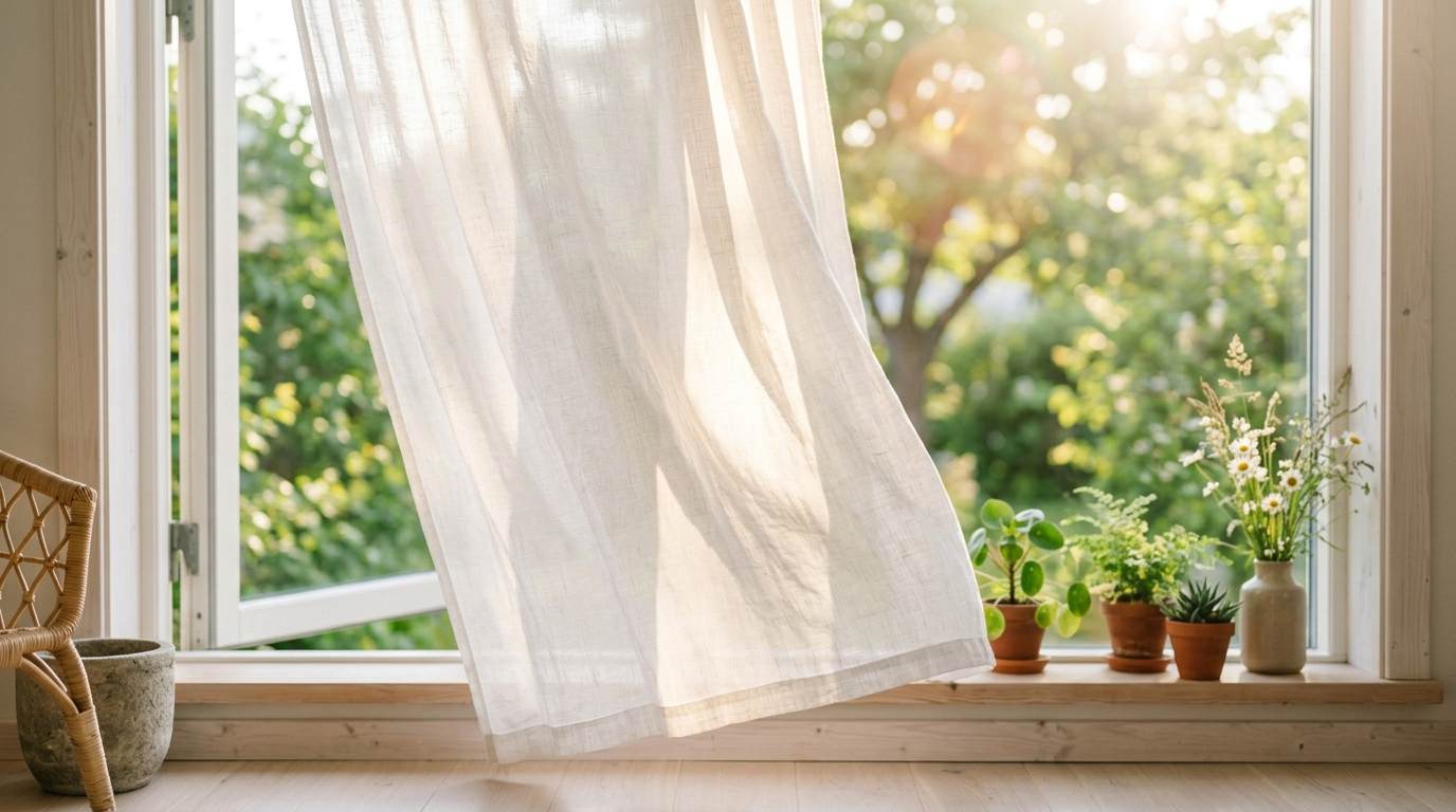 겨울 암막커튼을 그대로 두고 있다면 지금이 교체 적기입니다. 쉬폰, 보일, 얇은 린넨 커튼으로 바꾸면 자연광이 부드럽게 스며들면서 공간 전체가 환해집니다.