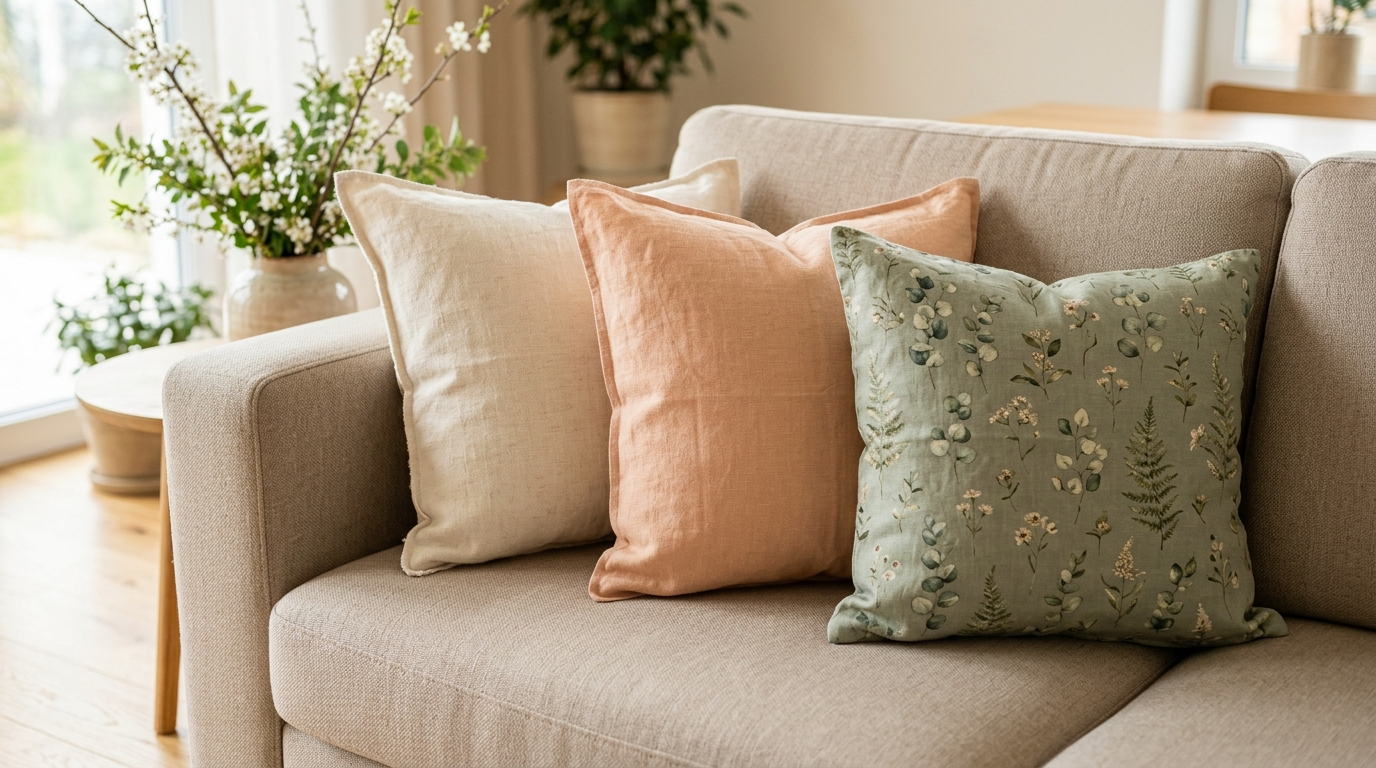 소파는 거실에서 가장 넓은 면적을 차지합니다. 그래서 쿠션커버 2~3장만 바꿔도 시선이 확 달라집니다. 봄에는 두꺼운 벨벳·니트 소재를 걷어내고, 가볍고 결이 살아 있는 린넨·면 소재로 교체하는 것만으로 계절감이 생깁니다.