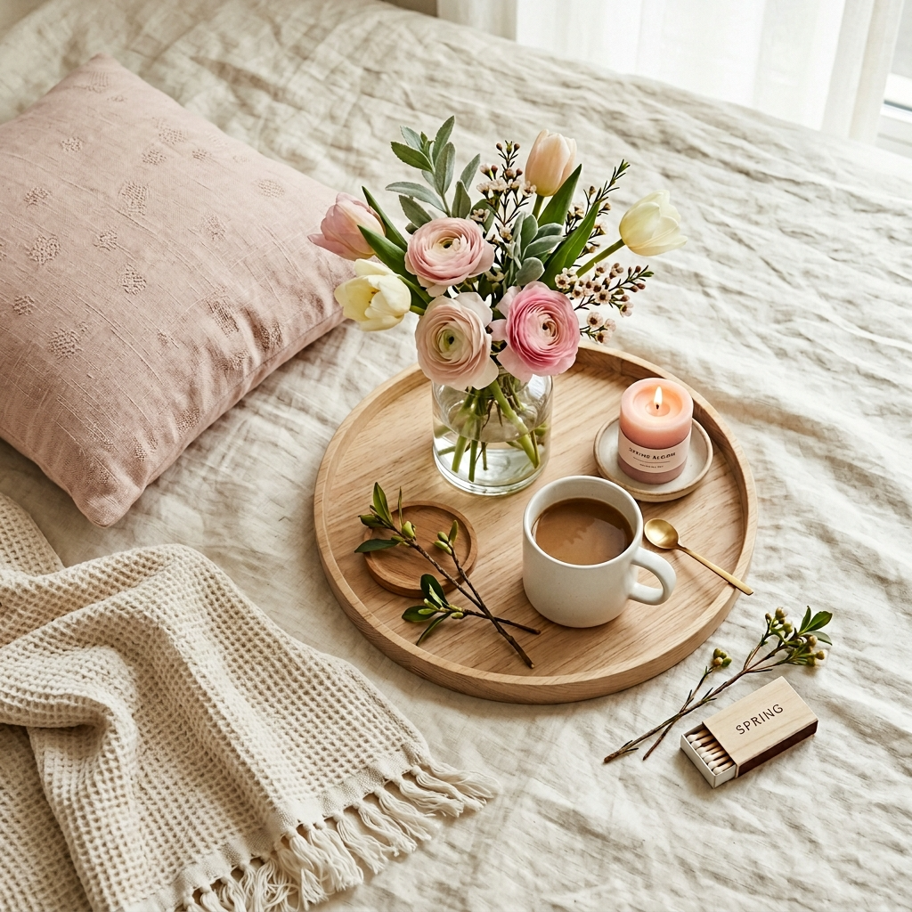 파스텔톤 세라믹 머그, 라탄 코스터, 내추럴 우드 트레이가 봄 식탁과 잘 어울립니다. 트레이 위에 캔들 + 작은 화병 + 머그를 함께 올려두면 카페 같은 세팅이 완성됩니다. 이런 작은 "비네트(소품 그루핑)"가 인테리어 완성도를 높이는 핵심 기법입니다.
