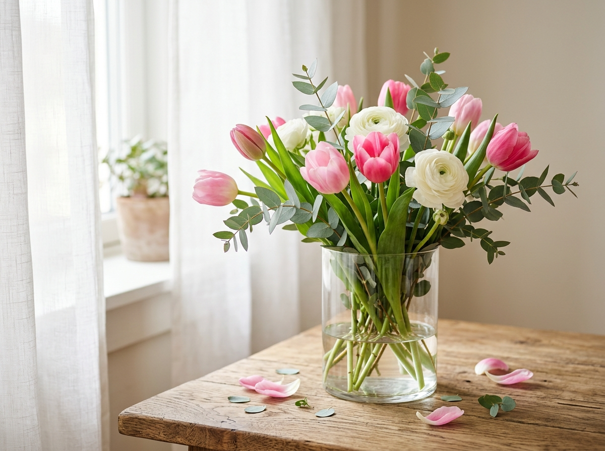 물은 이틀에 한 번 갈아주고, 줄기 끝을 사선으로 잘라주면 일주일 이상 싱싱하게 유지됩니다. 생화가 부담스러우면 고급 조화(실크플라워)도 요즘 퀄리티가 매우 좋아졌습니다.