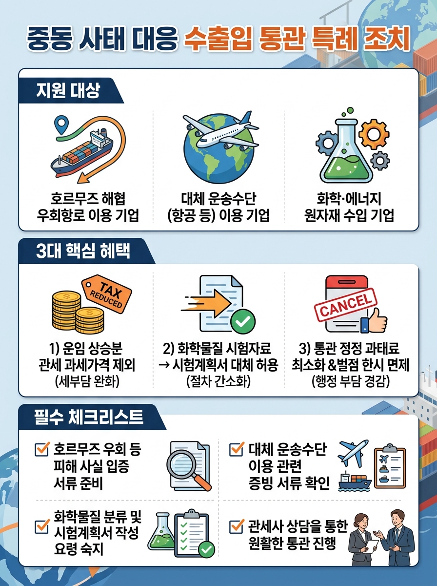중동 사태 장기화로 호르무즈 우회 항로 및 대체 운송수단을 이용해 늘어난 운임 상승분은 관세 과세가격에서 제외되어 수입·물류 기업의 세금 부담이 낮아집니다. 또한, 화학물질 수입 시 유해성 시험자료를 시험계획서로 대체 허용하여 통관 기간을 단축하며, 수출입 통관 정정 과태료 최소화 및 수출신고 취하에 따른 벌점은 한시적으로 면제됩니다.