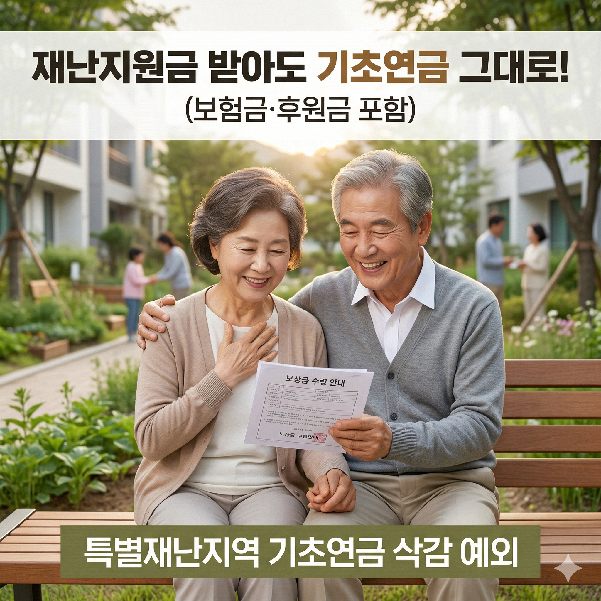 특별재난지역으로 선포된 곳에서 재난 피해 지원금, 후원금, 민간 보험금을 받더라도 기초연금 소득인정액 산정에서 전면 제외됩니다. 기존에는 이러한 피해보상금이 통장에 입금되면 일시적인 금융재산 증가로 잡혀 기초연금이 삭감되거나 수급 자격에서 탈락하는 억울한 사례가 있었습니다. 이번 제도 개선을 통해 재난 피해 복구 목적의 자금은 기초연금 수급액에 어떠한 부정적 영향도 주지 않도록 기준이 완화되었습니다.