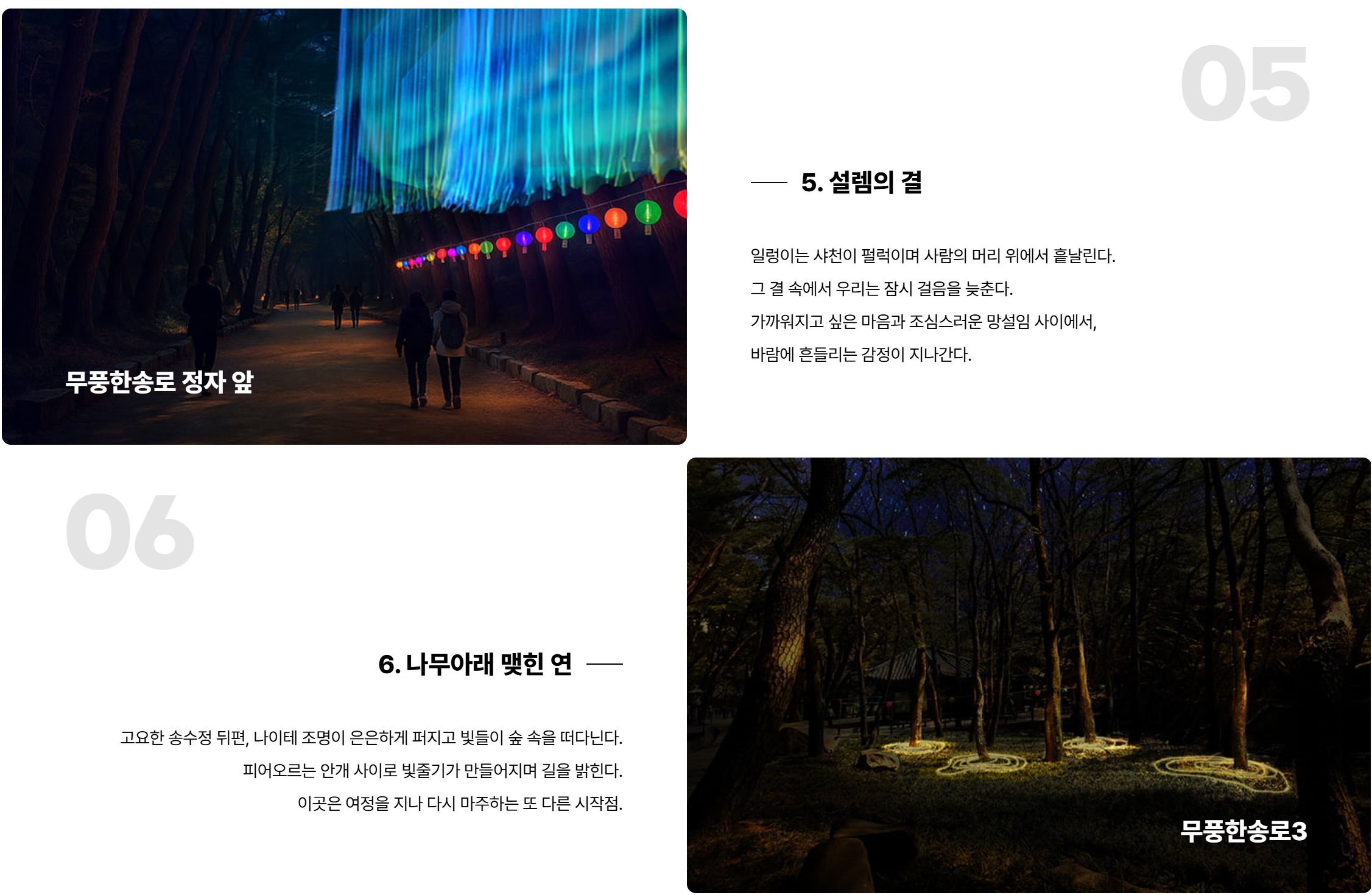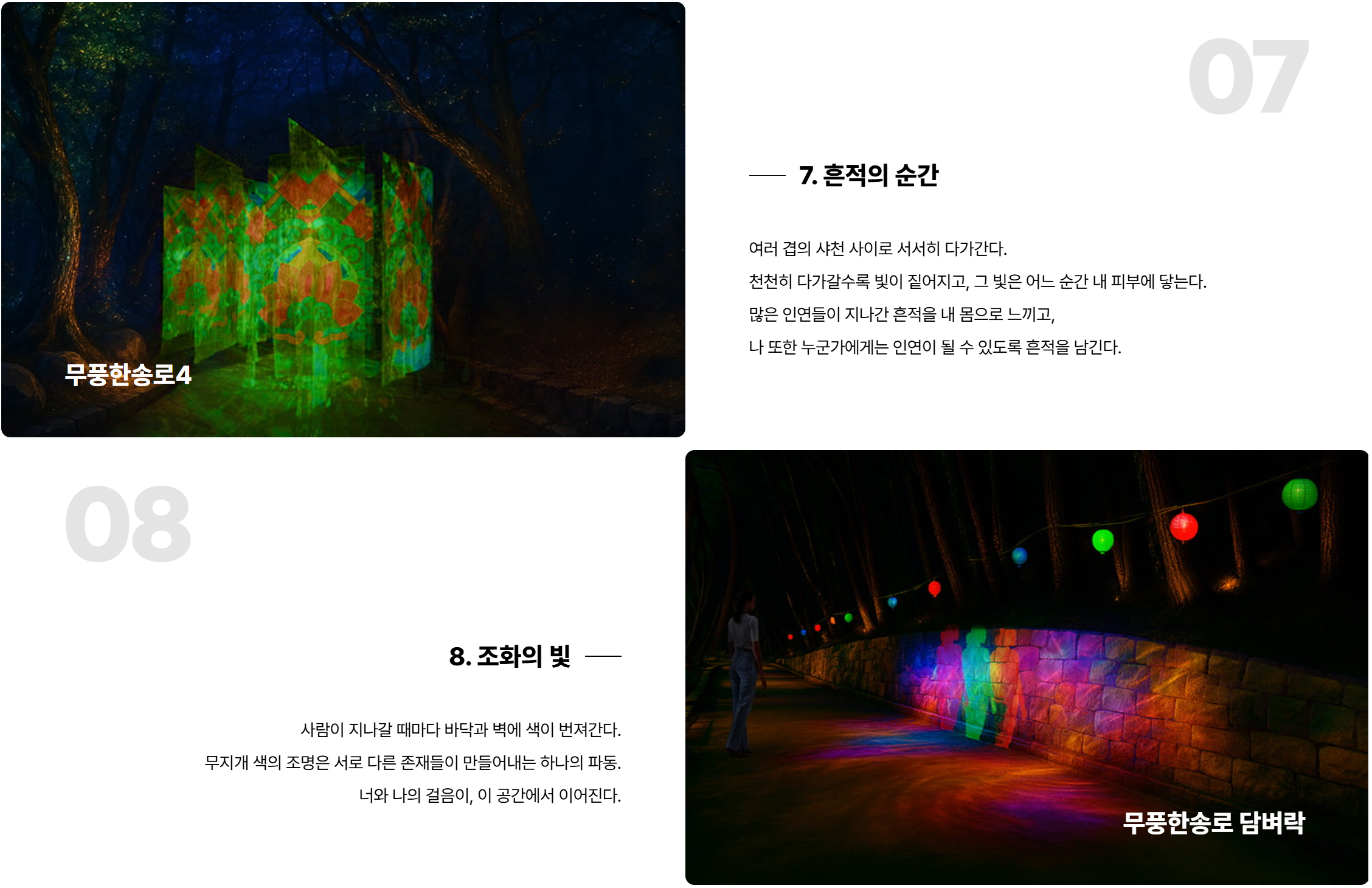 시시각각 변하는 자연과의 조화: 미디어아트는 고정된 작품이 아닙니다. 밤하늘의 별, 스쳐 지나가는 바람, 나뭇잎의 움직임 등 자연과의 상호작용 속에서 매 순간 다른 분위기를 연출합니다. 이 모든 것을 함께 느껴보세요.