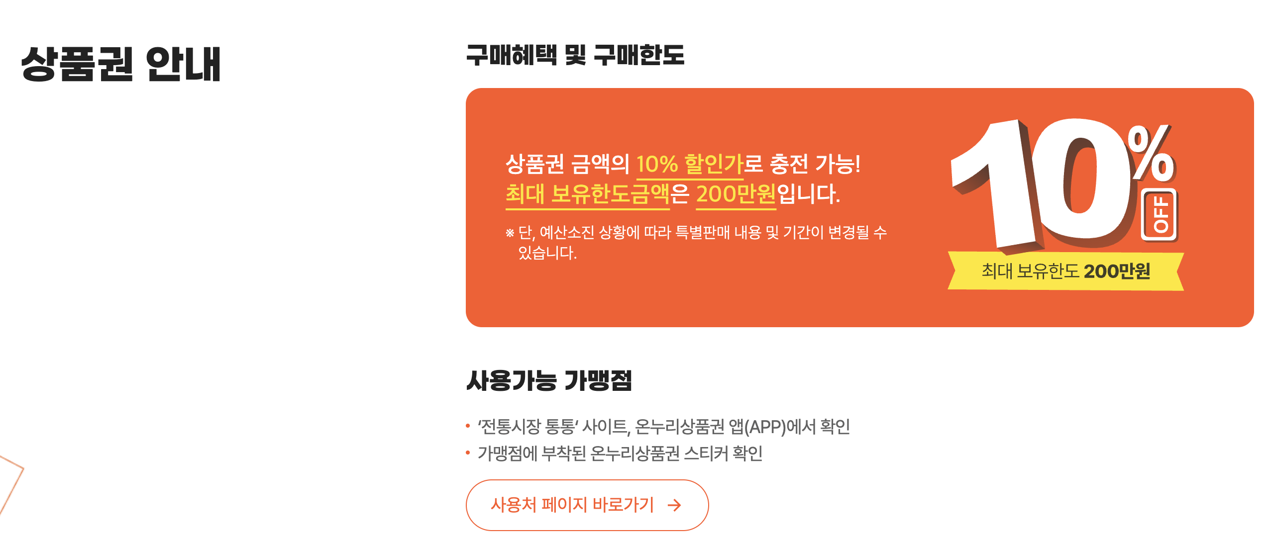 - 주요 사용처: 전국 전통시장, 상점가, 골목상권 내 온누리상품권 가맹점으로 등록된 점포 (정육점, 청과물점, 식당, 분식집, 옷가게, 동네 마트 등 거의 모든 업종)