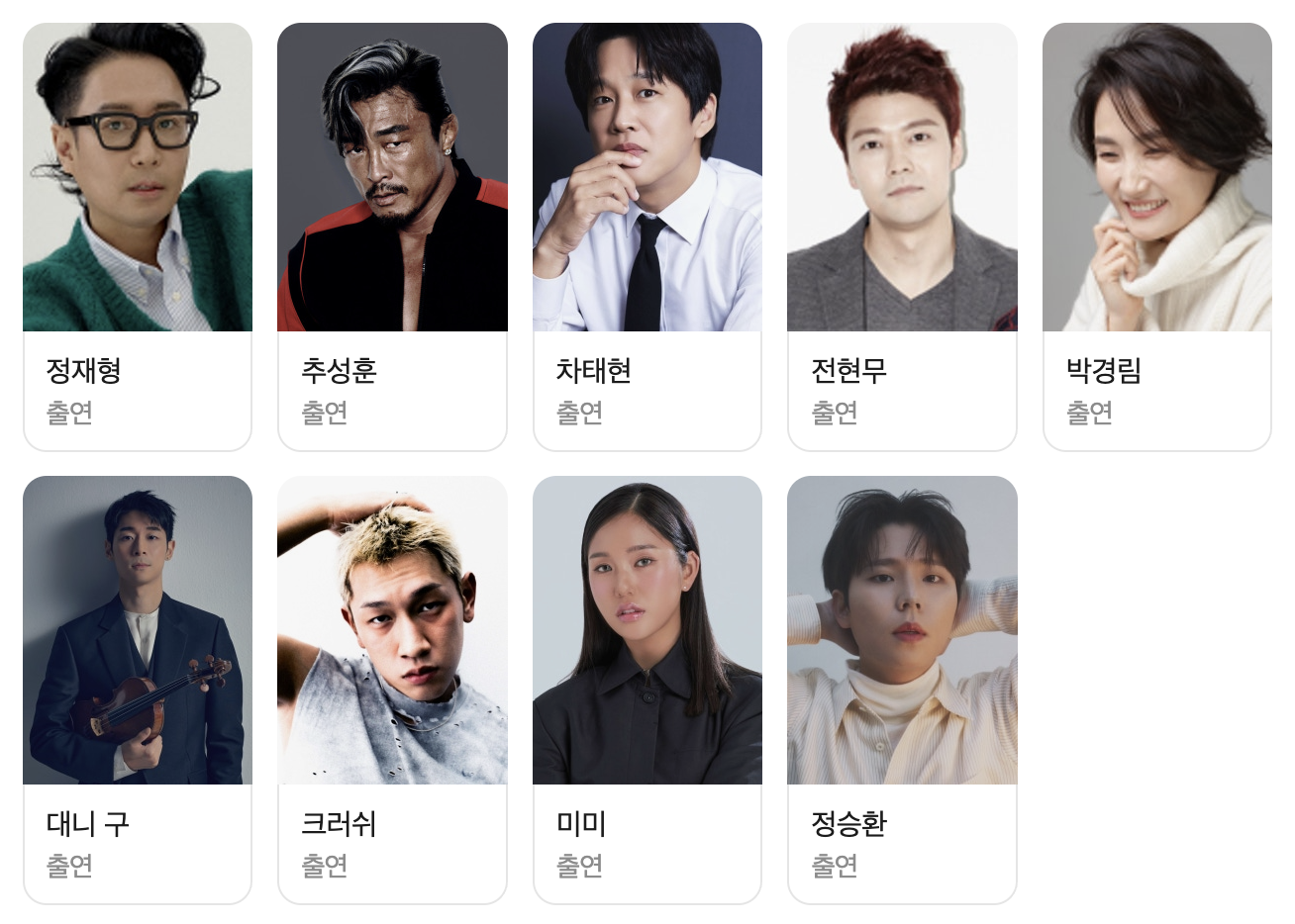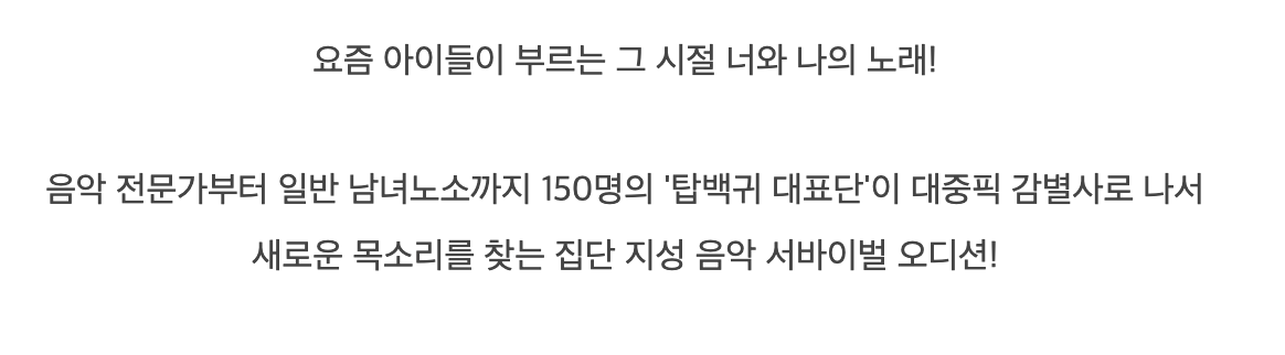 심사 또는 패널단 ('탑백귀 대표단'): 정재형, 추성훈, 차태현, 박경림, 대니 구, 크러쉬, 미미, 정승환 등 다양한 분야의 음악인과 예능인들이 출연하여 신선하고 다채로운 평가를 선보입니다. 이들의 조합이 주는 의외성과 재미가 또 하나의 관전 포인트죠.