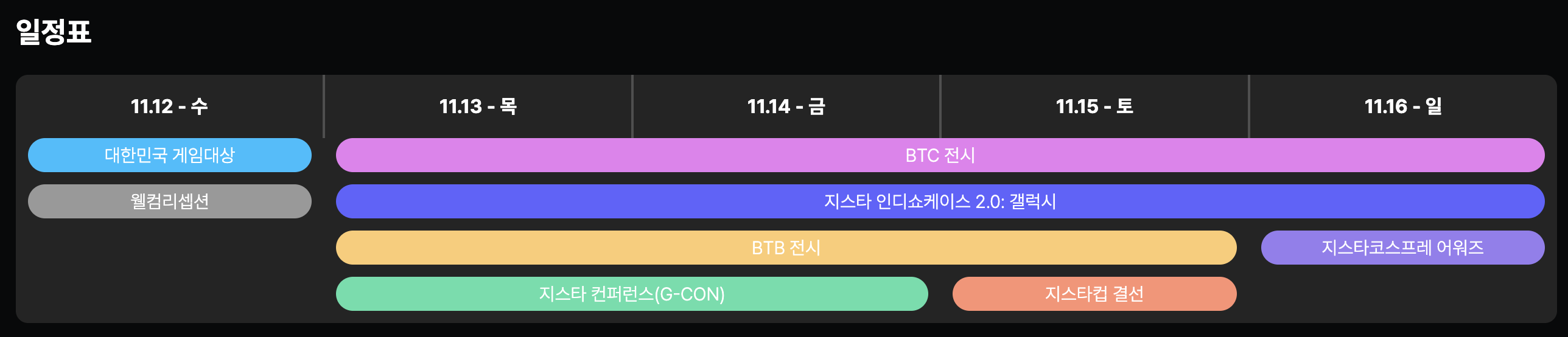 - BTC(일반 관람객): 2025년 11월 13일(목) ~ 16일(일), 4일간