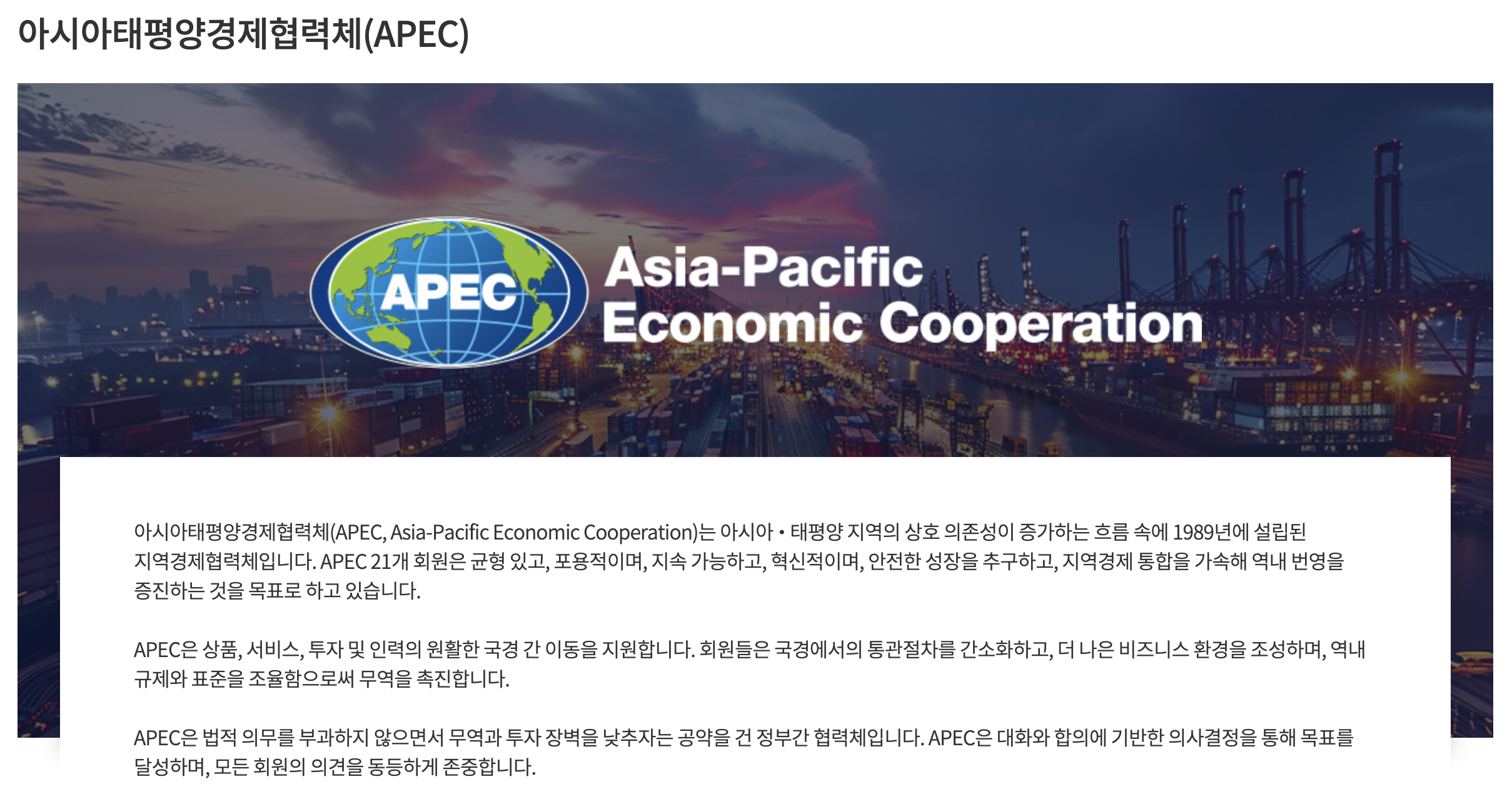 APEC은 전 세계 GDP의 약 61%, 교역량의 약 50%, 인구의 약 37%를 차지하는 세계 최대의 지역 협력체입니다. 의사결정은 컨센서스(consensus) 방식에 따르며, 법적 구속력은 없지만 회원국의 정책 방향을 결정하는 데 큰 영향을 미칩니다. 이처럼 강력한 '소프트 파워'를 가진 APEC은 지정학적 긴장과 무역 장벽이 높아지는 상황에서 더욱 중요한 의미를 갖습니다.