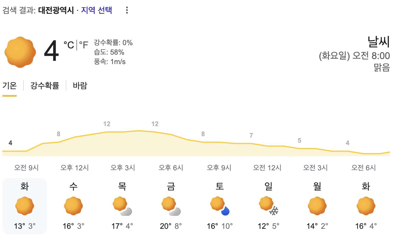 29일 대전은 맑은 날씨가 예상되며, 경기 진행에는 아무런 문제가 없을 것으로 보입니다. 오후 6시 30분 경기 시작 시각의 기온은 15도 내외로 쾌적하게 야구를 관람하기 좋은 날씨가 될 전망입니다. 다만, 밤에는 기온이 내려갈 수 있으니, 겉옷을 하나 챙겨가는 센스는 잊지 마세요!